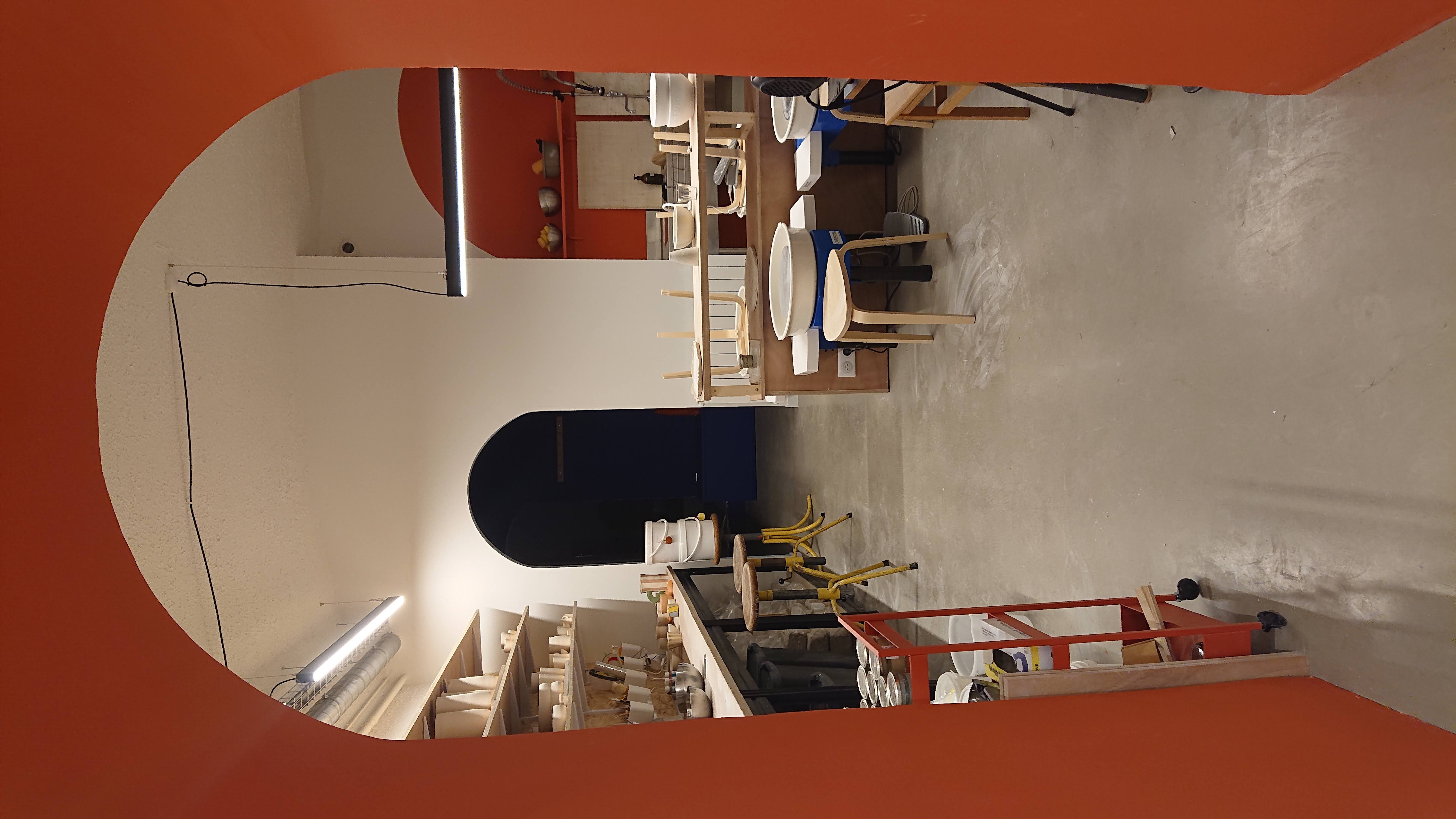 Agencement des espaces Accueil, Modelage, Tournage et Café.